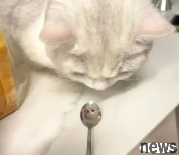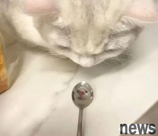 When the cat looks at the spoon... The picture in the spoon seems to be getting more and more wrong... When you zoom in, you will see that the cat has turned into a mouse, hahahaha! Meow: Oops, I was discovered! This spoon is a magic mirror!...