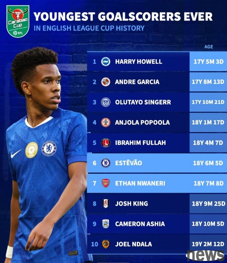 After many games in this round of the League Cup, Chelsea and Arsenal both advanced. An 18-year-old player from both teams scored a goal. Statistics show that the two ranked 6th and 7th on the League Cup's youngest goalscoring list respectively.