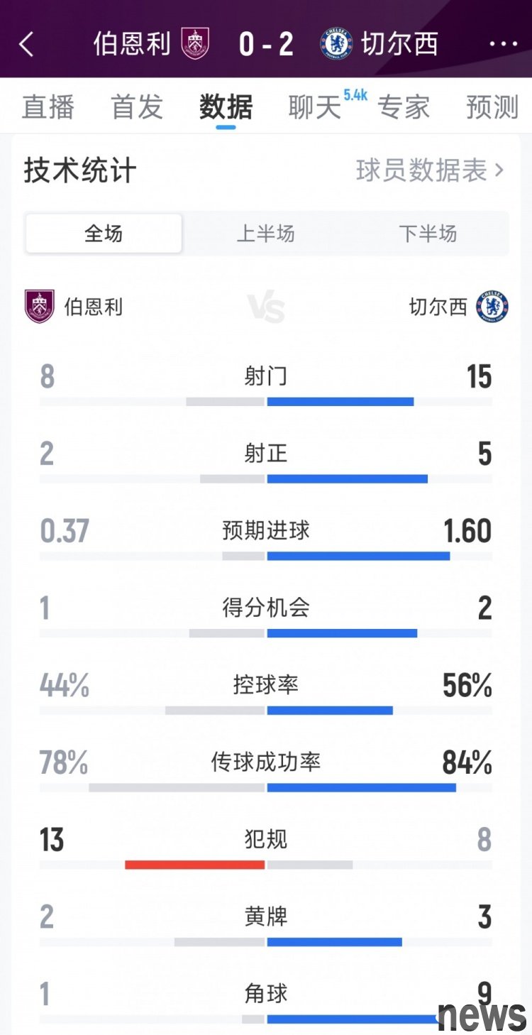 In this round of the Premier League, Chelsea defeated Burnley 2-0. The following is a comparison of the two sides' full-time statistics:
