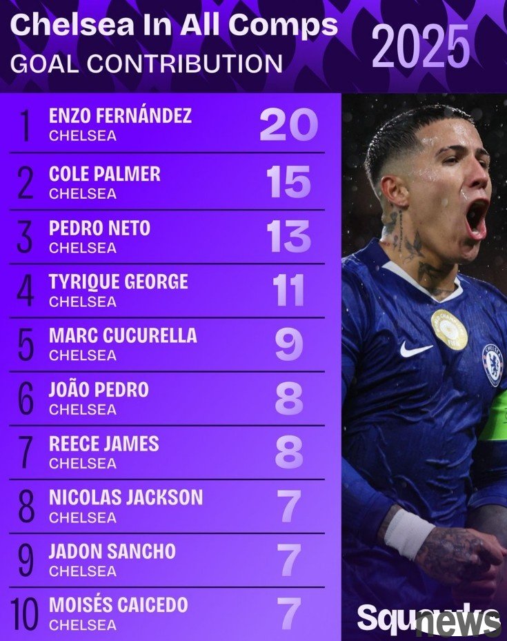 The data website Squawka has taken stock of the scoring list of Chelsea players in various competitions in 2025, as follows (goals + assists): 1. Enzo 20 goals 2, Palmer 15 goals 3, Neto 13 goals 4, George 11 goals 5, Cucurella 9 goals 6, Joao Pedro...