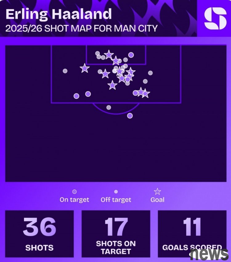 Squawka counts Haaland's data this season. He has played in 8 games in each event, scoring 11 goals and 8 goals in the last 5 games. Haland's shooting data this season: shots-36 shots-17 goal-11...