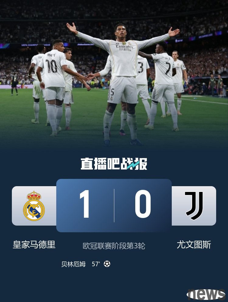 In this round of the Champions League focus match, Real Madrid defeated Juventus 1-0, and Bellingham scored the only goal of the game!