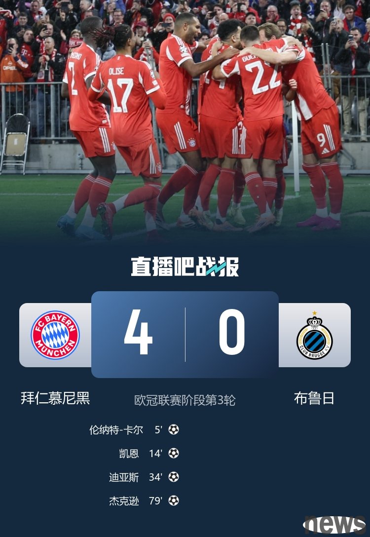 Bayern swept Bruges 4-0. Bayern has won 12 consecutive games in all competitions! In this game, Kane scored, Karl made waves, Laimer scored three goals, and Jackson and Dias made contributions.