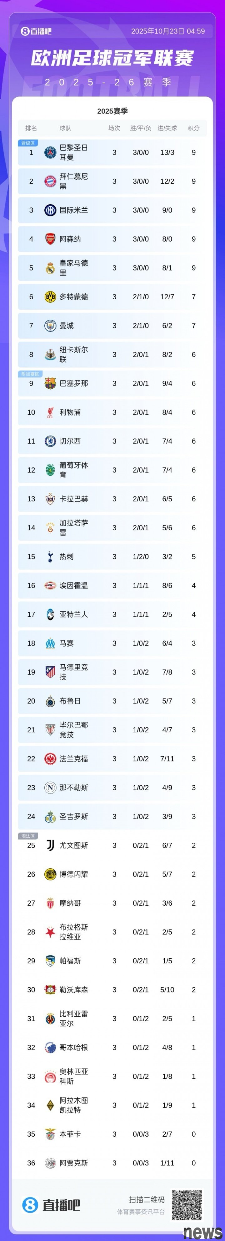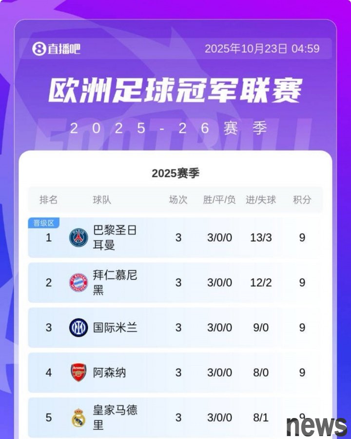 Champions League standings: 5 teams won all 3 rounds! Paris tops the list, Bayern Gunners, Real Madrid and Inter Milan are on the list
