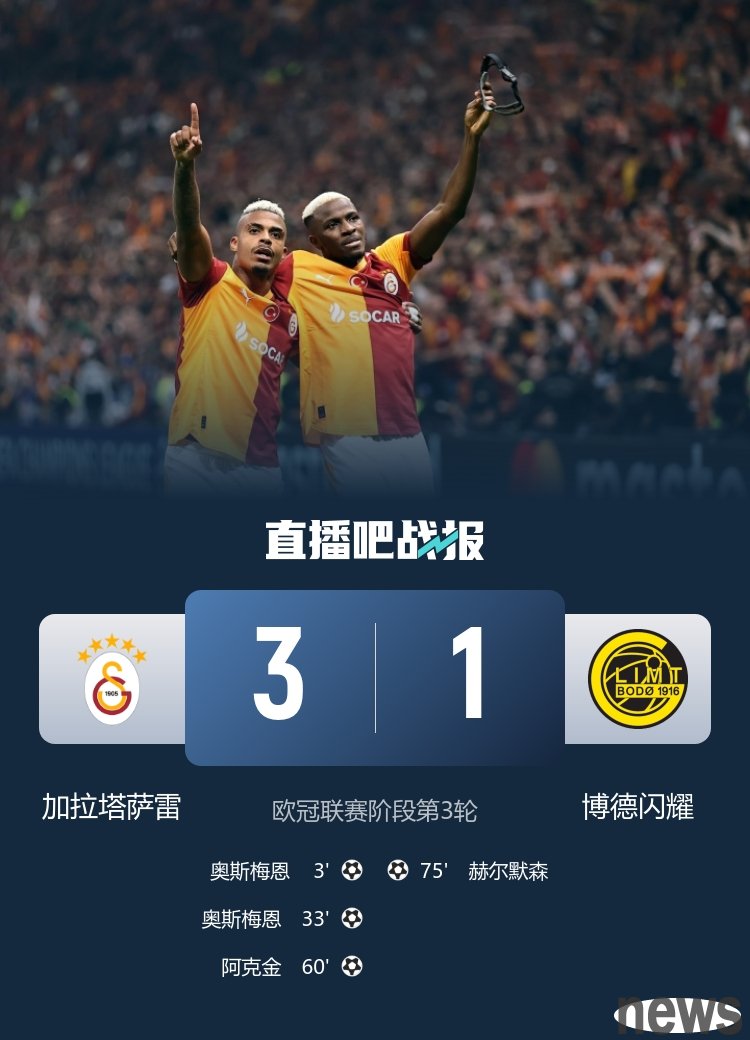 In this round of the Champions League, Galatasaray beat Bode 3-1 at home, Osmeen doubles and Akkin scores.