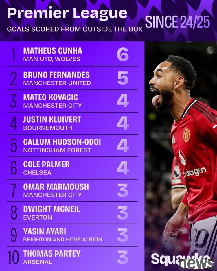 Manchester United defeated Brighton 4-2 in this round of the Premier League, and Cunha scored from a long shot. Statistics show that he is also the player who has scored the most goals outside the penalty area in the Premier League so far last seaso...