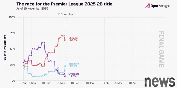 Opta shared the trend of the Premier League title probability so far this season: Liverpool has dropped from being optimistic at the beginning of the season to the current 7%, Arsenal is currently 63.6%, and Manchester City is currently 22.9%