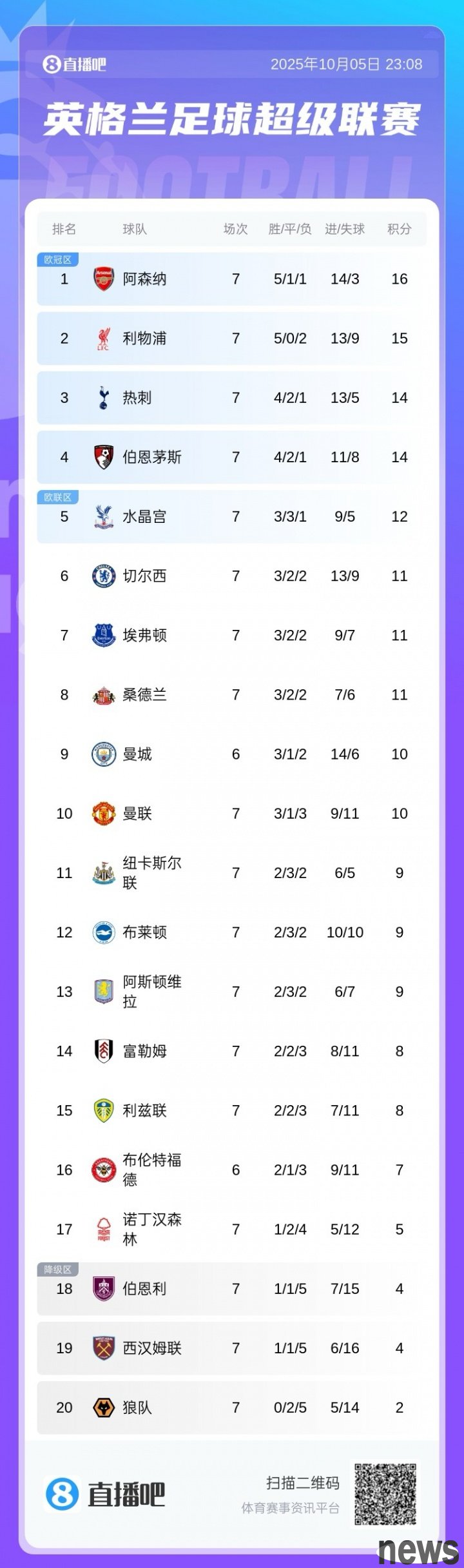 Today, the Premier League ended many competitions, and Crystal Palace was defeated by Everton in the first season. Currently, there are no unbeaten teams in the Premier League, and the latest standings are shown in the picture....